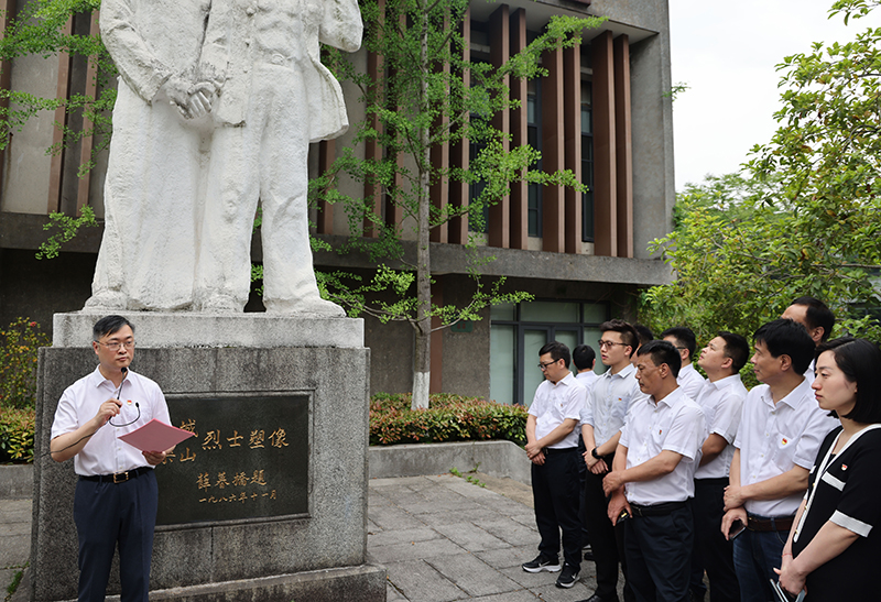 在沈干城、沈樂山烈士塑像前,鄭浩為大家講述了兩位烈士對杭州工人運動的偉大貢獻,回顧了馬克思主義在杭州的傳播與影響,并帶領大家重溫了入黨誓詞。